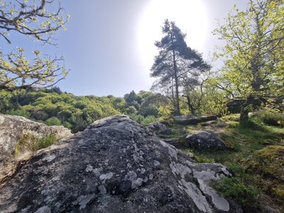 - Peu après, prendre un chemin de terre sur la gauche et rester sur le chemin du haut qui permet d’admirer la vue sur la cité de Treignac. Continuer le chemin jusqu’à un grand virage, l’accès au Rocher des Folles se fait par un aller-retour de 15 min.